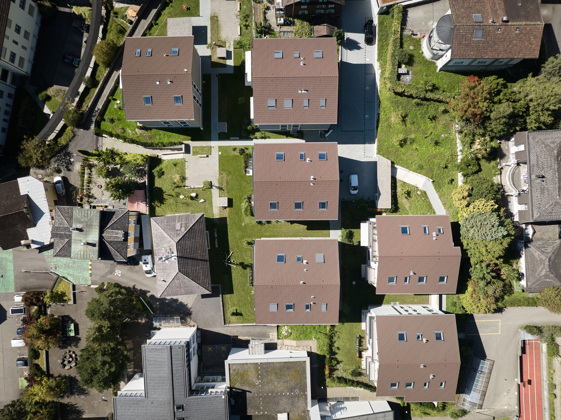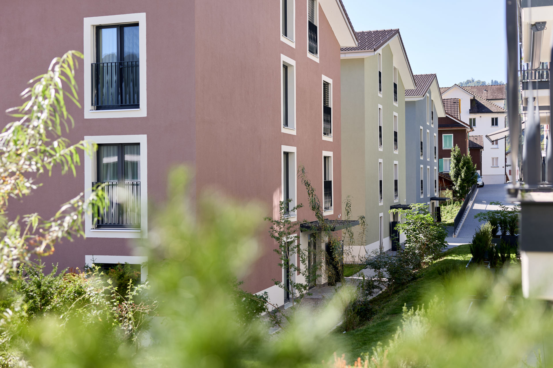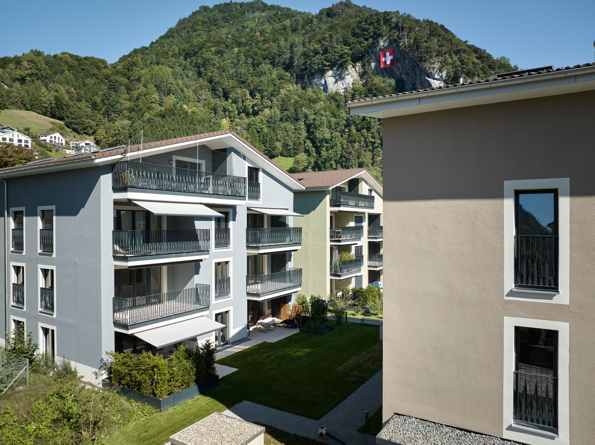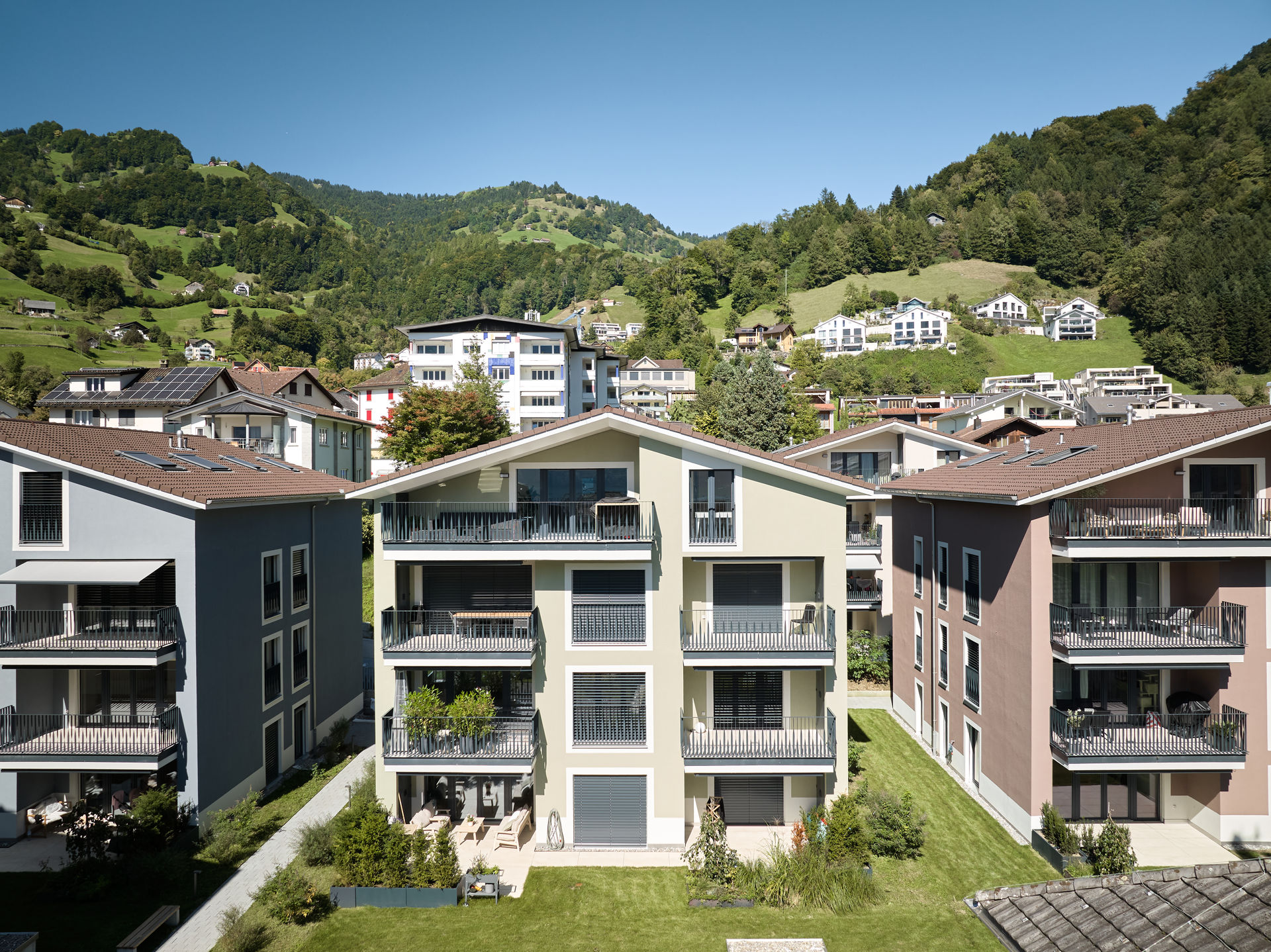 Im Dorfzentrum stand eine grosse Parzelle mit Villa zum Verkauf, auf der bereits eine Gestaltungsplanung vorlag. Für einen Investor und Generalunternehmer überarbeiteten wir das bestehende Projekt und passten es an die Wünsche des Investors an. Das Bauprojekt begleiteten wir planerisch bis zur Ausführung und übergaben es anschließend der Generalunternehmung. Zudem übernahmen wir das Controlling der Bauarbeiten und die Bauherrenvertretung. Entstanden sind sechs farblich differenzierte Wohnbauten, die sich harmonisch dem dörflichen Charakter anpassen. Die Gebäude sind über eine unterirdische Einstellhalle verbunden, die im Dorfzentrum ausreichend Parkplätze schafft, ohne wertvolle Freiflächen zu beanspruchen.