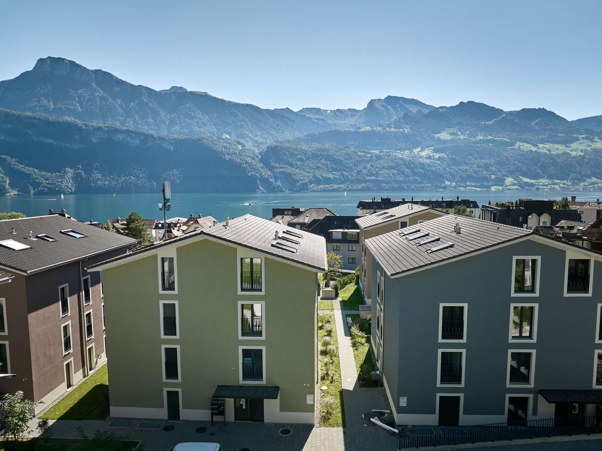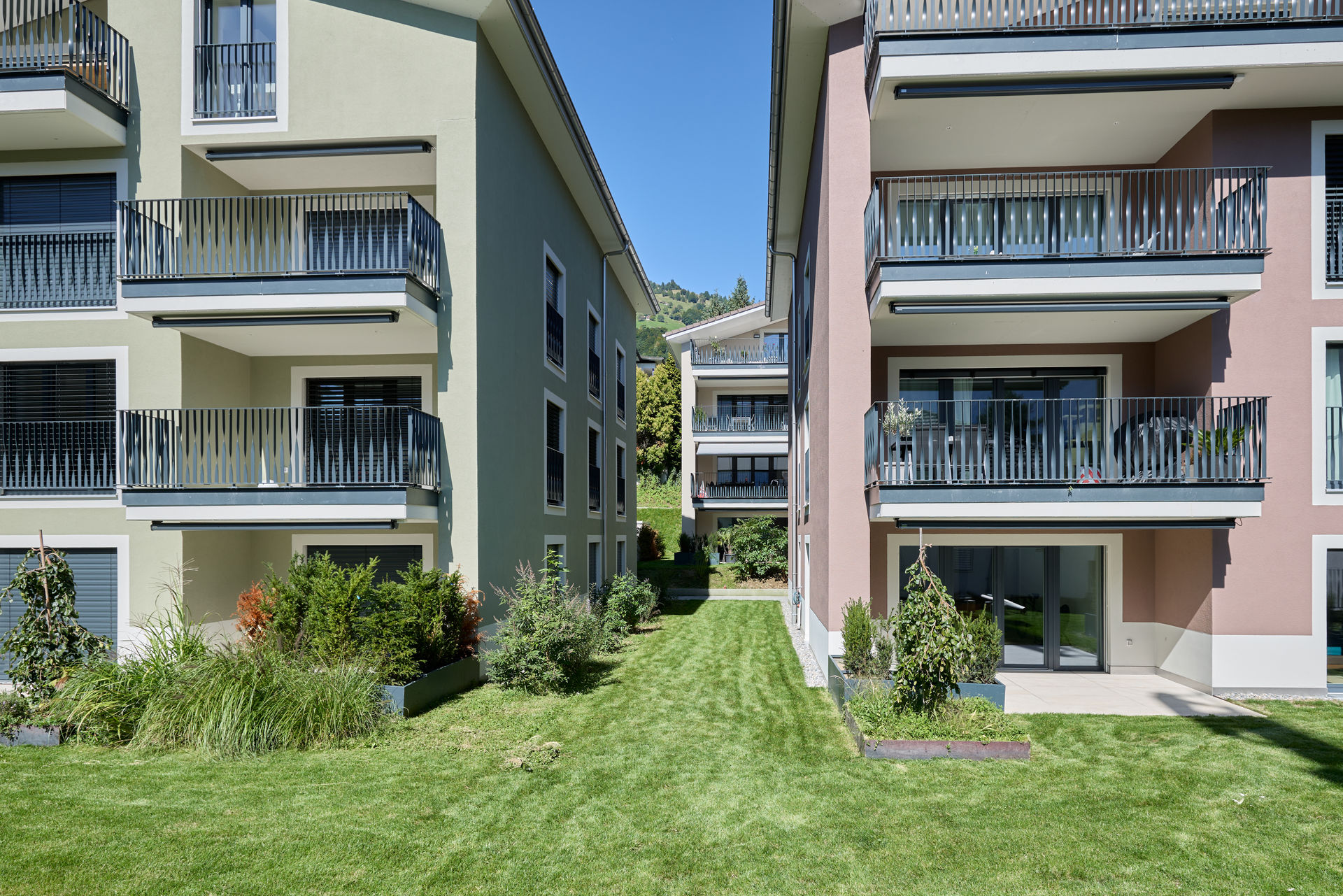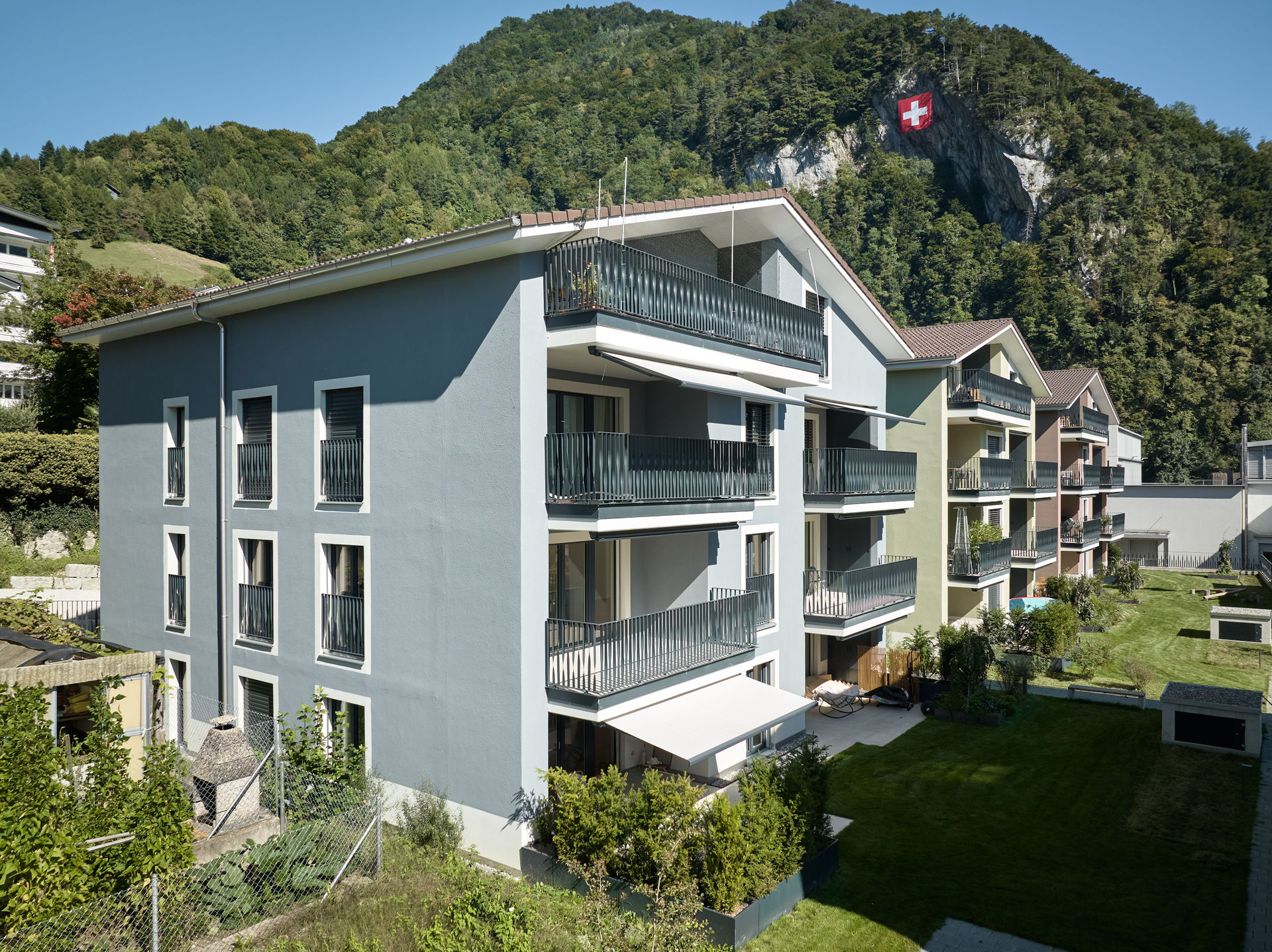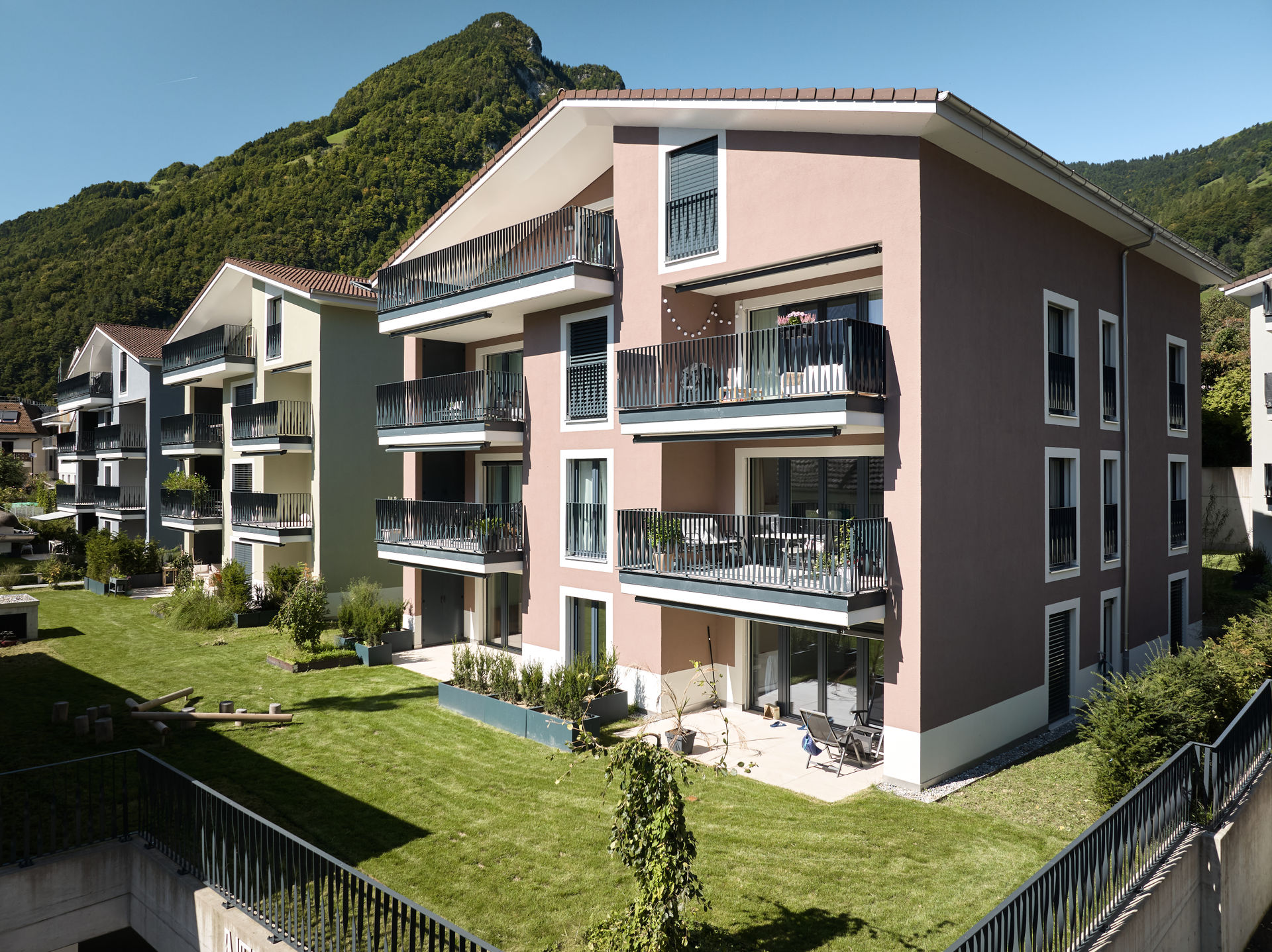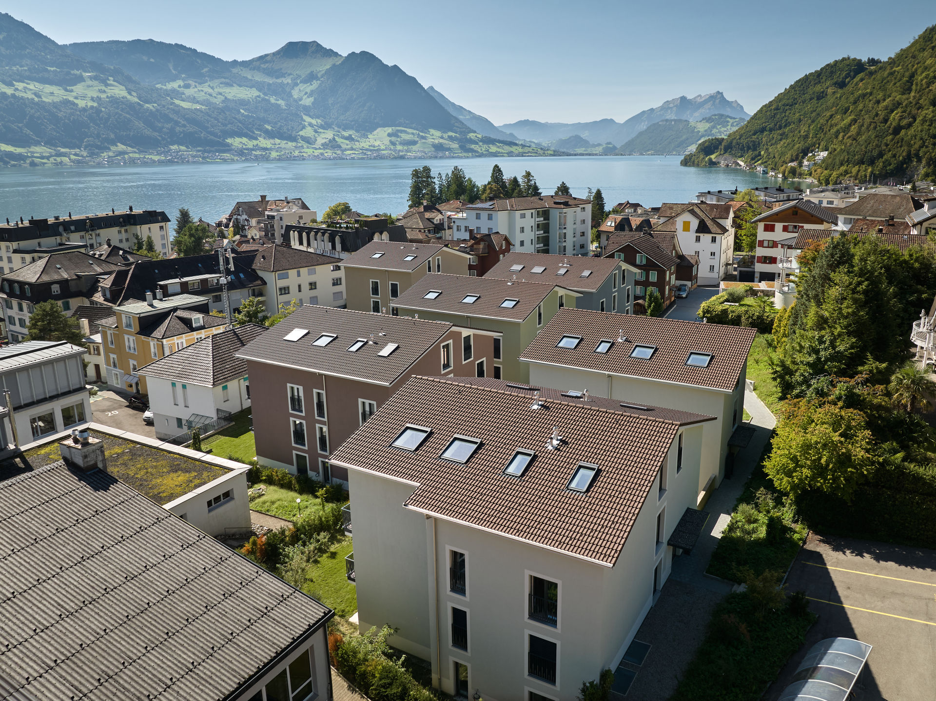 Im Dorfzentrum stand eine grosse Parzelle mit Villa zum Verkauf, auf der bereits eine Gestaltungsplanung vorlag. Für einen Investor und Generalunternehmer überarbeiteten wir das bestehende Projekt und passten es an die Wünsche des Investors an. Das Bauprojekt begleiteten wir planerisch bis zur Ausführung und übergaben es anschließend der Generalunternehmung. Zudem übernahmen wir das Controlling der Bauarbeiten und die Bauherrenvertretung. Entstanden sind sechs farblich differenzierte Wohnbauten, die sich harmonisch dem dörflichen Charakter anpassen. Die Gebäude sind über eine unterirdische Einstellhalle verbunden, die im Dorfzentrum ausreichend Parkplätze schafft, ohne wertvolle Freiflächen zu beanspruchen.