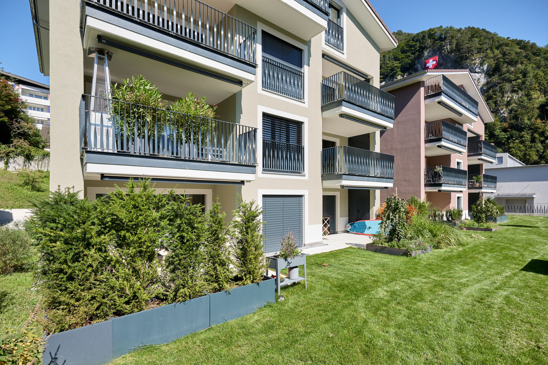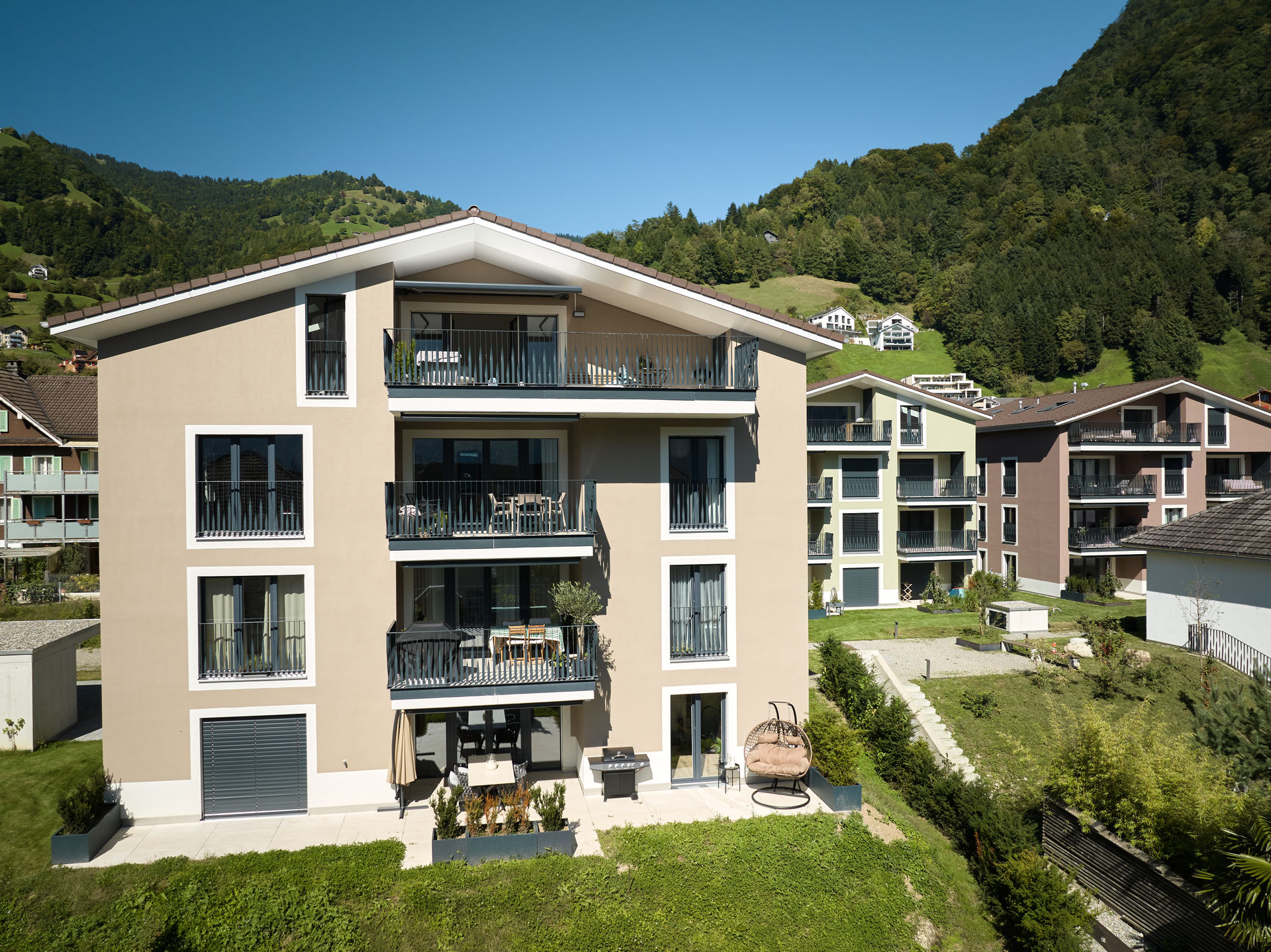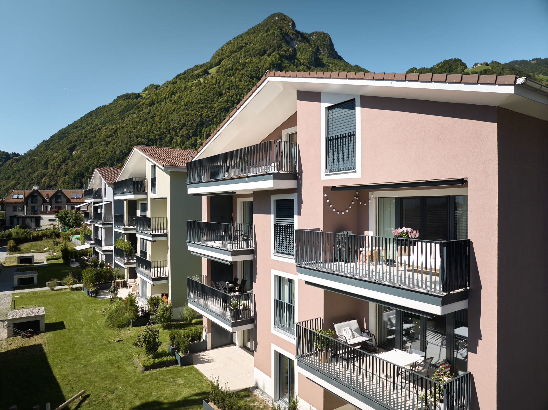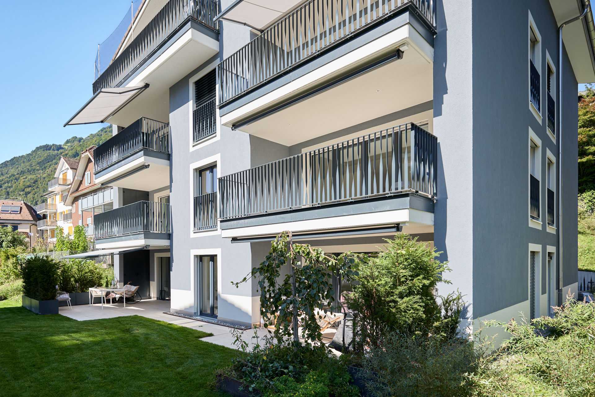 Im Dorfzentrum stand eine grosse Parzelle mit Villa zum Verkauf, auf der bereits eine Gestaltungsplanung vorlag. Für einen Investor und Generalunternehmer überarbeiteten wir das bestehende Projekt und passten es an die Wünsche des Investors an. Das Bauprojekt begleiteten wir planerisch bis zur Ausführung und übergaben es anschließend der Generalunternehmung. Zudem übernahmen wir das Controlling der Bauarbeiten und die Bauherrenvertretung. Entstanden sind sechs farblich differenzierte Wohnbauten, die sich harmonisch dem dörflichen Charakter anpassen. Die Gebäude sind über eine unterirdische Einstellhalle verbunden, die im Dorfzentrum ausreichend Parkplätze schafft, ohne wertvolle Freiflächen zu beanspruchen.